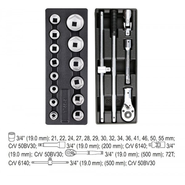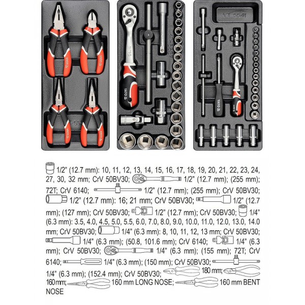 Dílenská skříňka značky YATO, vybavena 7 zásuvkami s kuličkovým ložiskem, 5 horních zásuvek obsahuje 165 pečlivě vybraných nástrojů. Centrální zamykání na klíč, skříňka je vybavena protiskluzovými kolečky s brzdami a rohovými nárazníky.