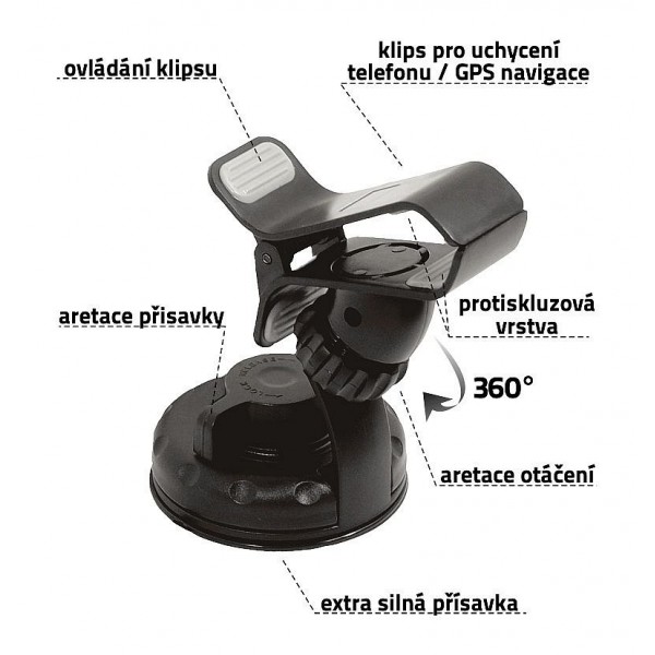 Držák telefonu s extra silnou přísavkou a klipsem pro uchycení telefonu či navigace až do šířky (nebo výšky) 10 cm.