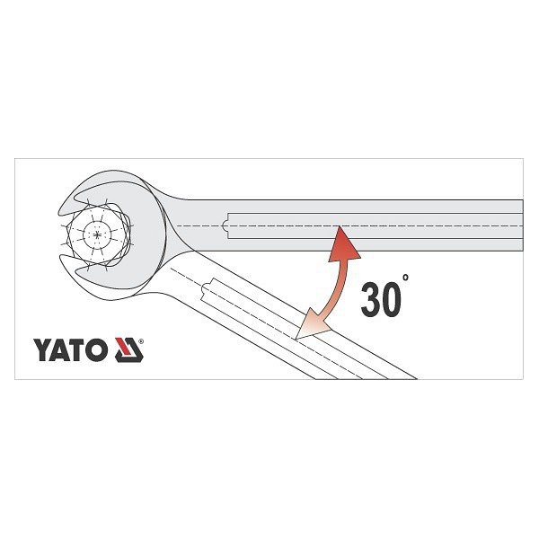 Očkoplochý klíč Yato vyrobený z chromvanadiové slitiny oceli, povrch je částečně satinovaný a leštěný do vysokého lesku. AS-Drive je vylepšený profil u nástrčných a očkových klíčů, v tomto případě očka.