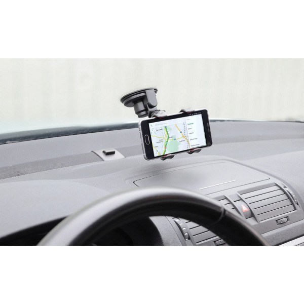 Držák telefonu s extra silnou přísavkou a klipsem pro uchycení telefonu či navigace až do šířky (nebo výšky) 9 cm. Díky možnosti otáčení o 360° je možné snadno nastavit vhodnou polohu. Telefon v klipsu pevně drží pomocí silné pružiny.