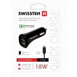 Auto nabíječka CL Quick Charge 3.0, 12V-24V, 5V, 2400mA, 18W, rychlo nabíjení telefonů a GPS, černá, SWISSTEN