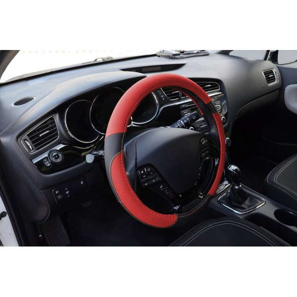 Stylový potah volantu s unikátním provedením, v pastelově červené barvě s černým podkladem a pastelově červeným prošíváním. Potah je příjemný na omak, ergonomicky tvarovaný s perforací pro usnadněný úchop. Potah chrání volant před opotřebením.
